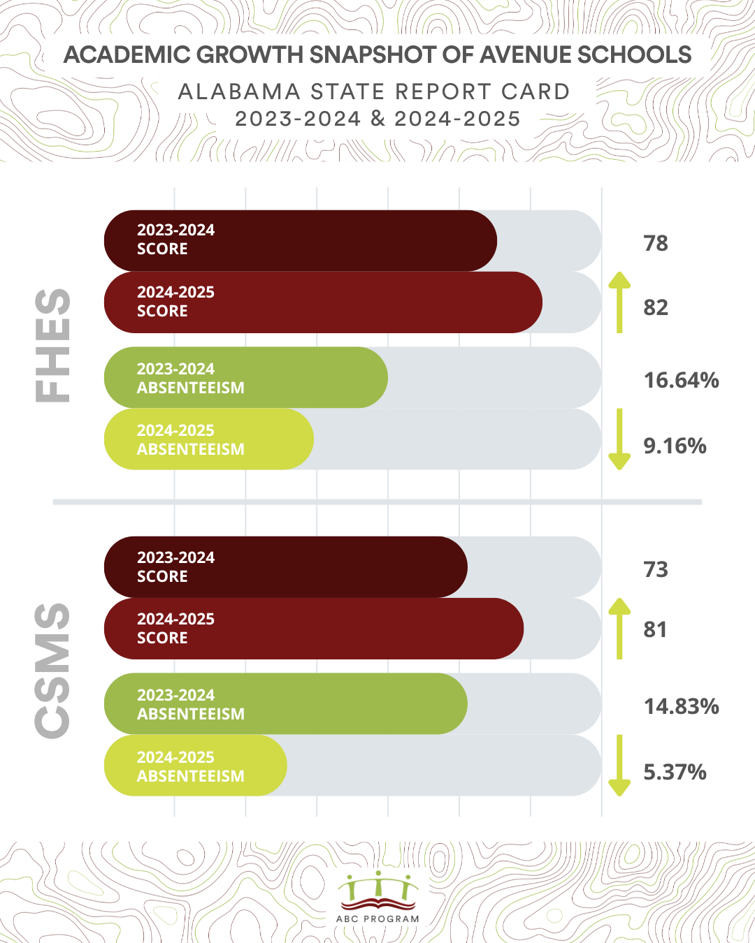 The Alabama State Report Cards for 2024–2025 reflect meaningful and encouraging progress in the Avenue schools we serve. At Florence Howard Elementary School, the overall score increased from 78 to 82, alongside a dramatic drop in chronic absenteeism—from 16.64% to 9.16%. Calloway-Smith Middle School experienced even greater gains, with its score rising from 73 to 81 and chronic absenteeism falling from 14.83% to just 5.37%. These improvements point to more than academic growth alone; they signal stronger student engagement, consistent attendance, and school environments where students are showing up ready to learn.